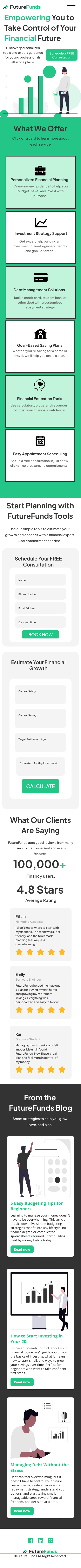 For my UX and UI Design course, I learned how to use Figma to design both desktop and mobile interfaces. Over the semester, I created a full website concept for FutureFunds, a financial planning service aimed at young professionals. The project included high-fidelity desktop and mobile mockups that showcased user-friendly navigation, clear service offerings, and strong calls-to-action tailored for the brand’s goals.